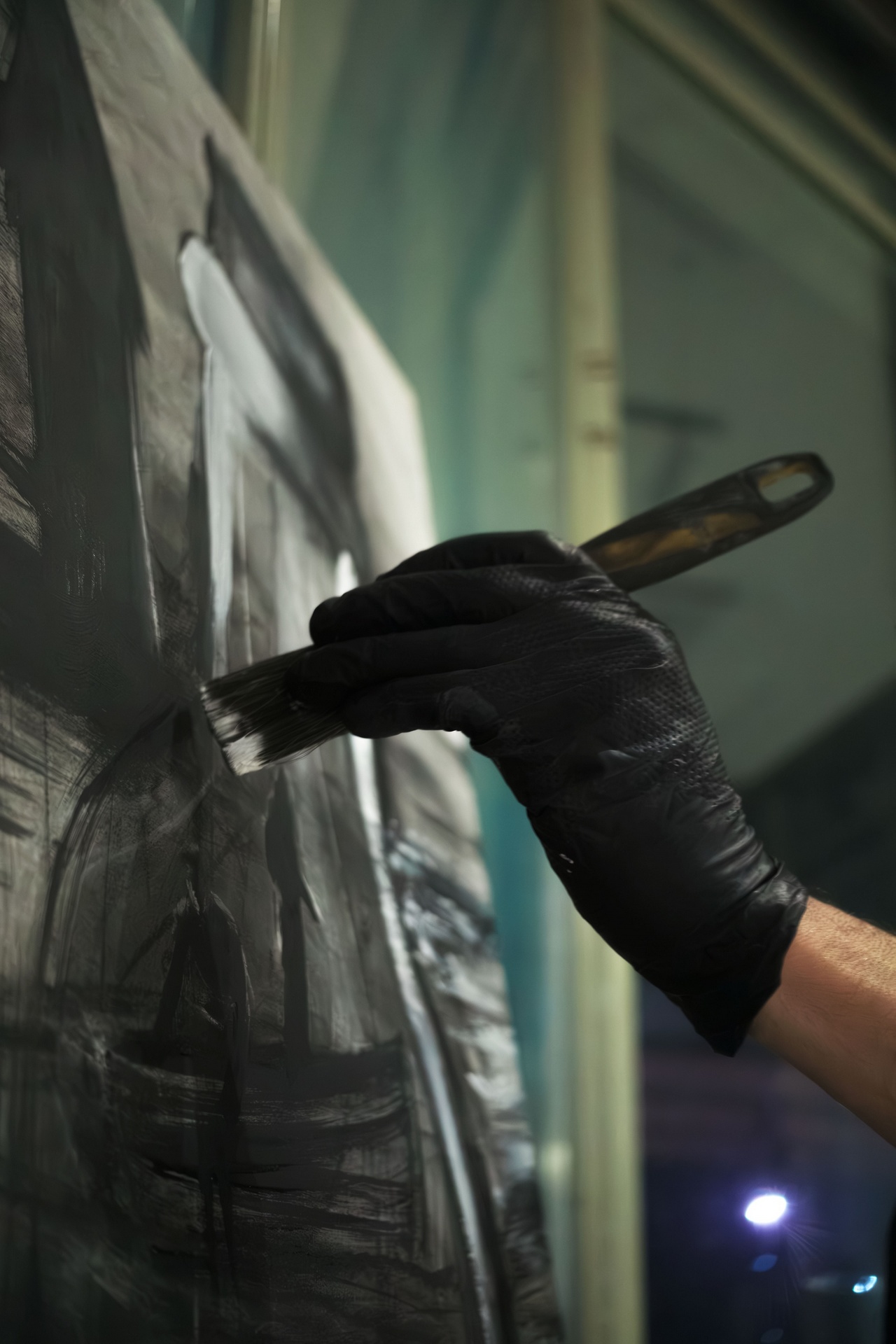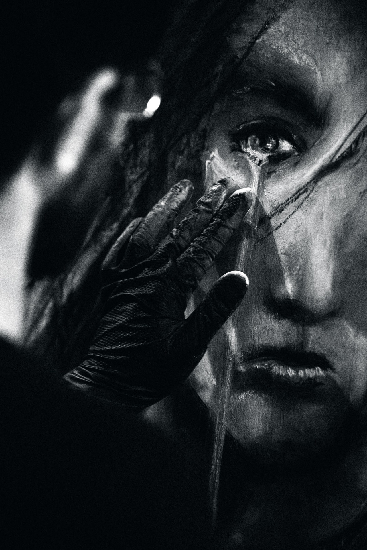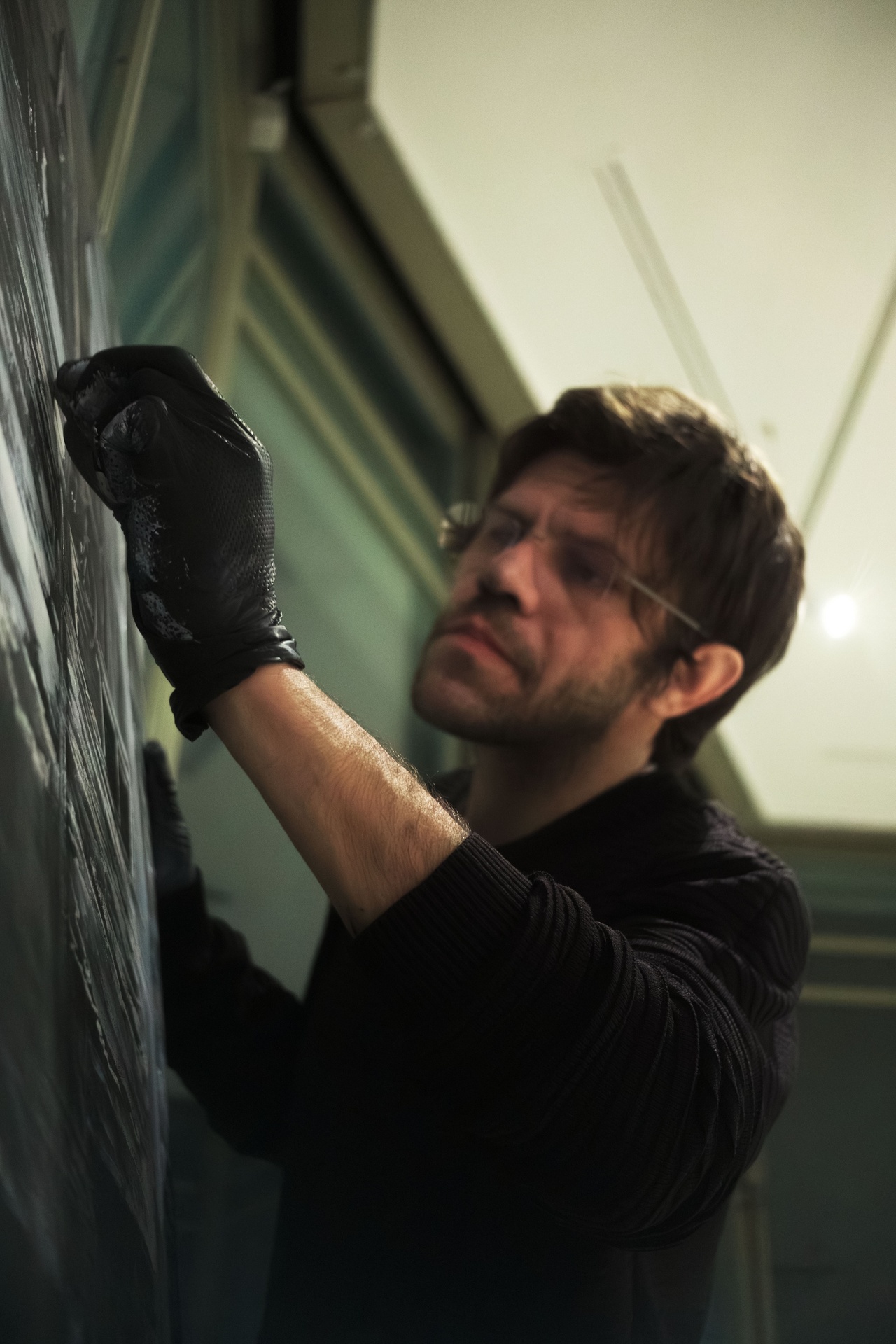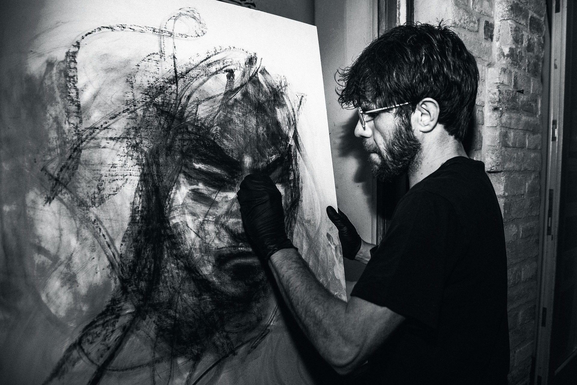 Carbone e gesso con chiazze di acrilico su pannelli di